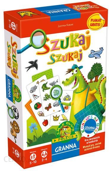 Szukaj szukaj to gra wymagająca spostrzegawczości oraz rozwijająca umiejętność klasyfikowania, stopniowania i kojarzenia faktów. Rozgrywka polega na wybraniu losowym 20 plansz, ułożenie obrazkiem do dołu, zakręcenie wskazówką, która wskaże obowiązujące pytanie np. co najmniejsze, co największe, co nie pasuje do zbioru itp. Odkrywamy planszę i próbujemy odpowiedzieć na postawione pytanie. Gracz, który odpowie pierwszy prawidłowo otrzymuje punkt. Rozgrywkę wygrywa gracz, który uzbiera największą ilość punktów z wszystkich plansz.W zestawie 12 dwustronnych obrazków (każdy złożony z 4 elementów), kostka do gry i instrukcja. Ciekawym dodatkiem jest 12 wierszy Wojciecha Widłaka.Całość w estetycznym i solidnym pudełku tekturowym o wymiarach: 273 x 189 x 53 mm.Liczba graczy: 2-4. Wiek 5 -10 lat.
